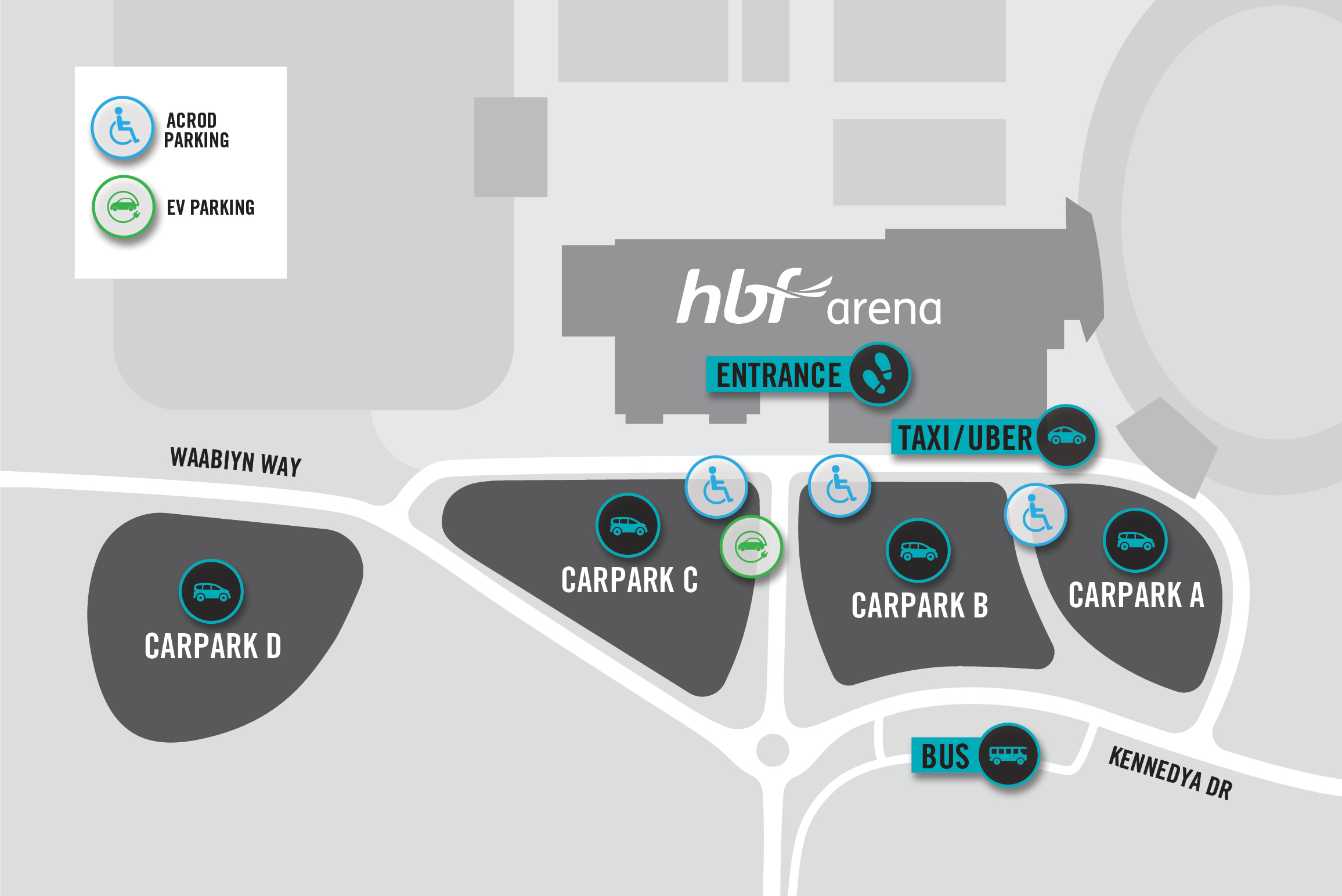 - Two dual output EV charge stations, providing four bowsers are located in HBF Arena carpark C.