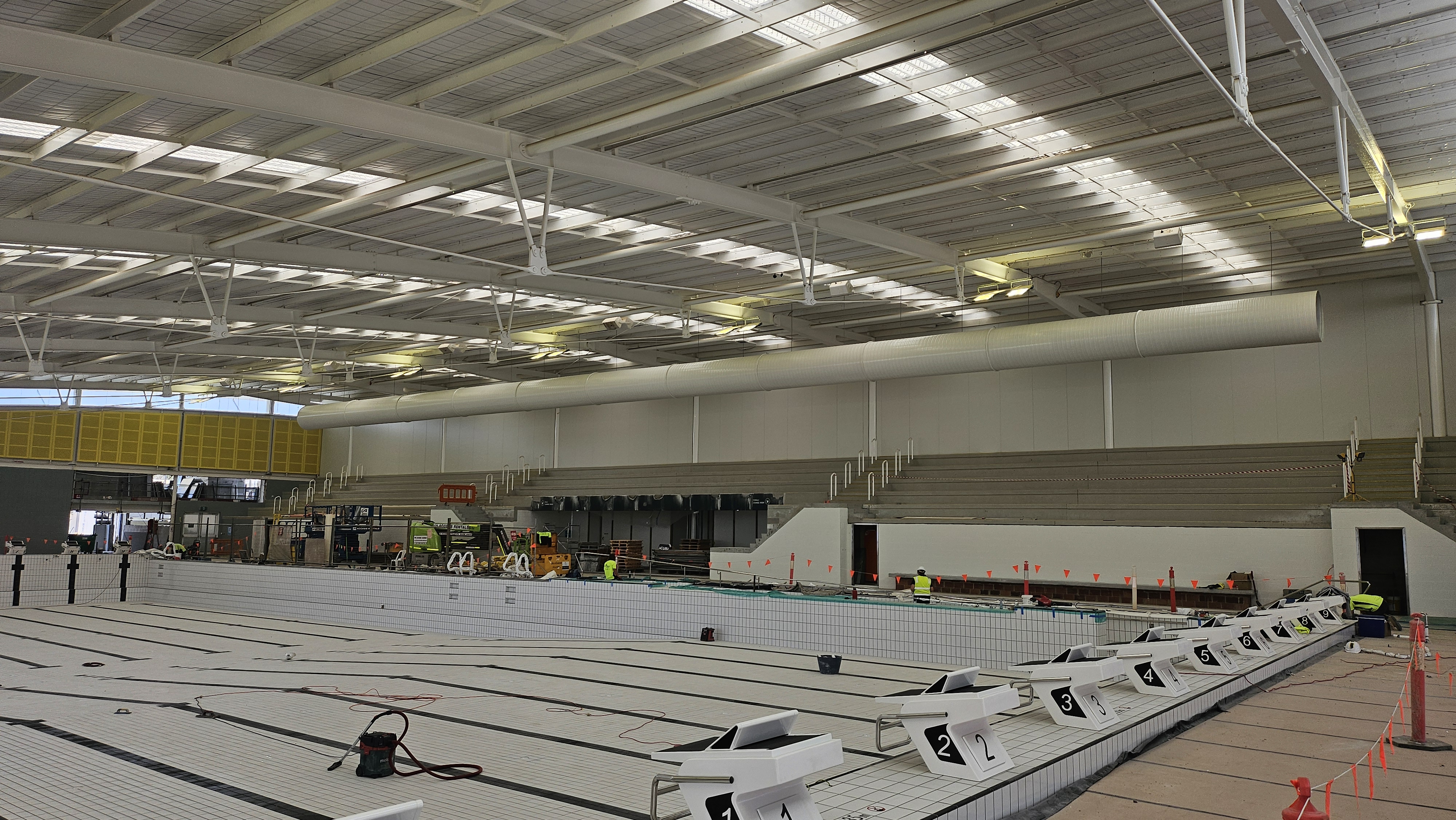 The concrete shell is now complete, including the new ramp and stair access. Structural steel for the eastern pool hall extension is also place.
